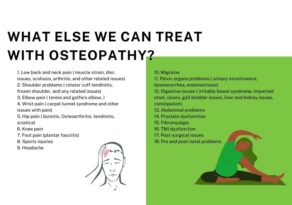 Manual Osteopathy is a philosophy of science and art, its science include the chemical, physical and biological sciences related to the maintenance of health and the prevention, cure and alleviation of disease. It is a hands on manual therapy technique, designed to help the system and structures of the human body function better by giving a holistic approach.
